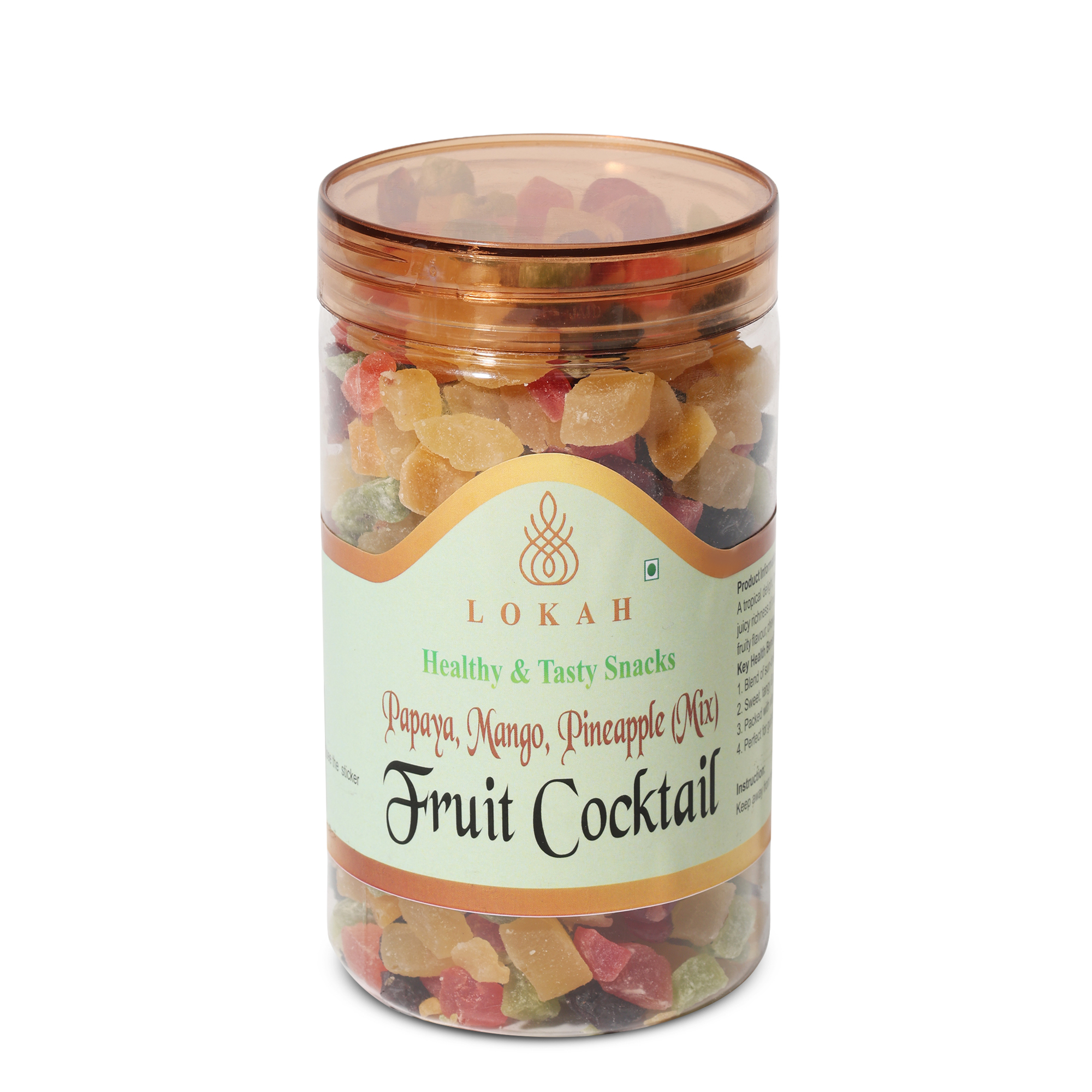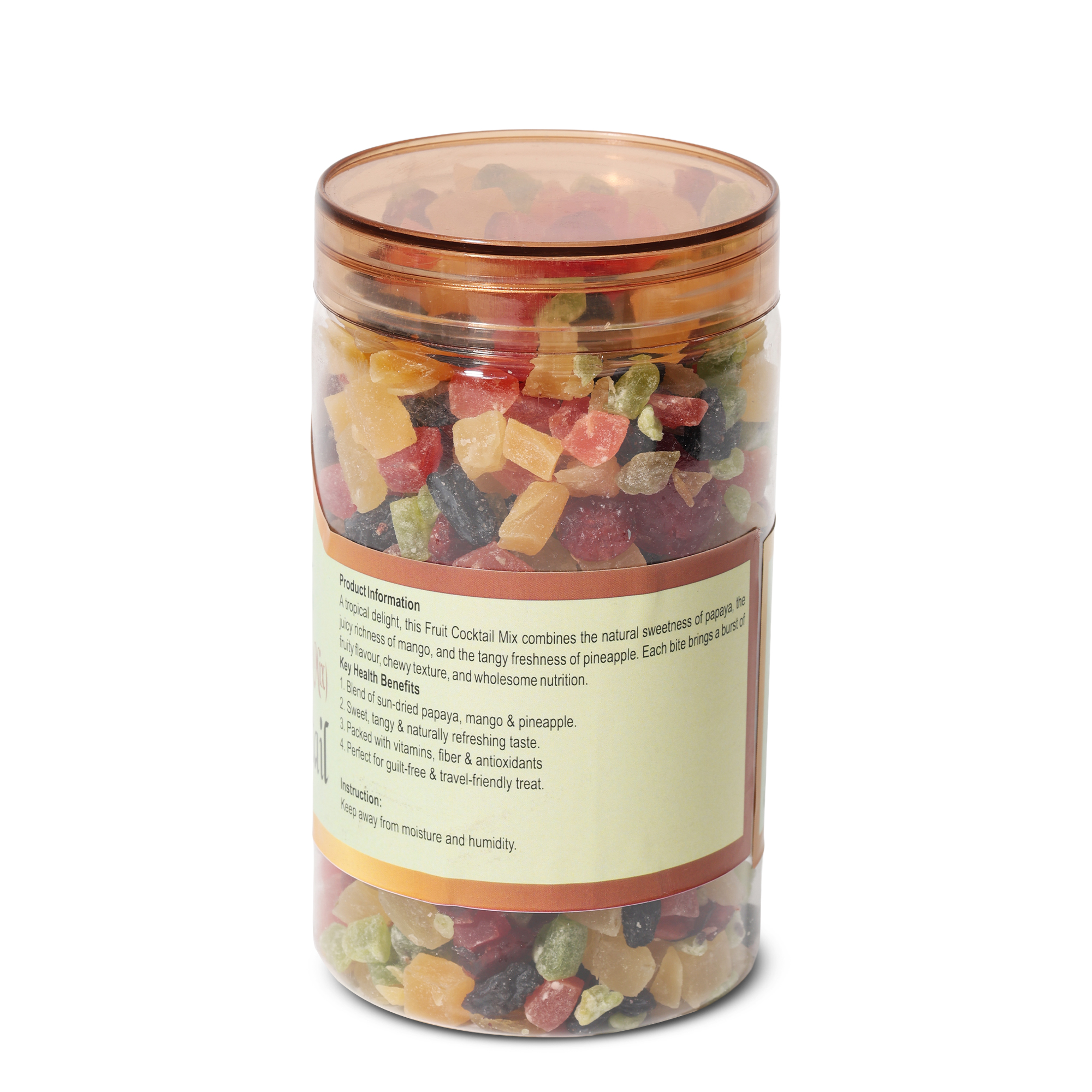 A tropical delight, this Fruit Cocktail Mix combines the natural sweetness of papaya, the juicy richness of mango, and the tangy freshness of pineapple. Each bite brings a burst of fruity flavour, chewy texture, and wholesome nutrition.